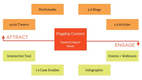 - Flagship Content — This is the central asset of the campaign. It’s the meal. It’s the big idea in all its glory. Ideally, it’s the findings of a substantive research study on the topic at hand. Regardless, it’s long-form content that presents the firm’s unique perspective on the topic in-depth. It could be a 15-20 page eBook or a 100+ page research report. No matter what it is, it should be the definitive source of the firm’s perspective on the topic. For the client, consuming this piece of content could represent a significant investment in time — anywhere from 15-20 minutes to an hour or more.
