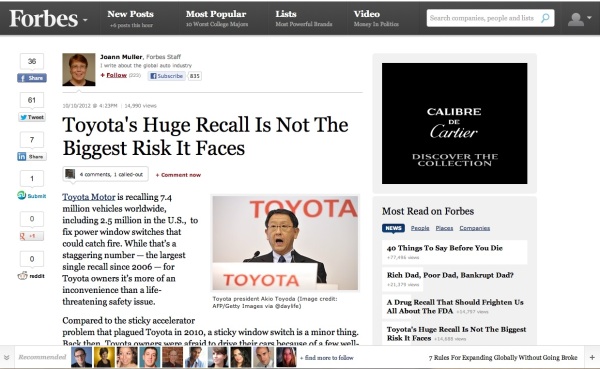 Simultaneously, the website was opened up through very relevant, very detailed social media integration. It’s easy for a site visitor to follow a writer or a contributor. Comments, call outs and shares are readily and easily available. The site lists the number of views, the number of likes, and the number of tweets any article gets. And, it showcases which Forbes writers and contributors recommend what content.